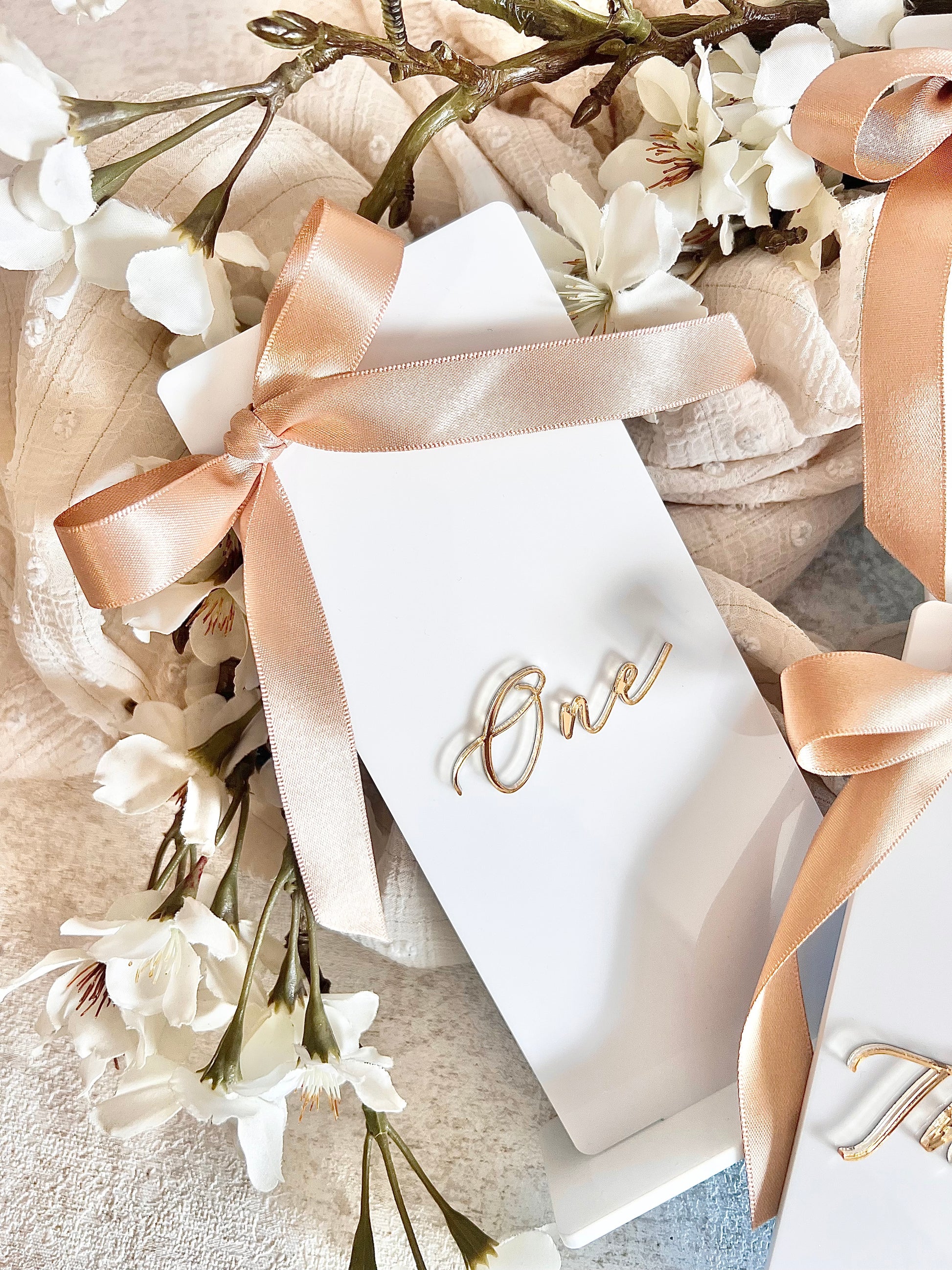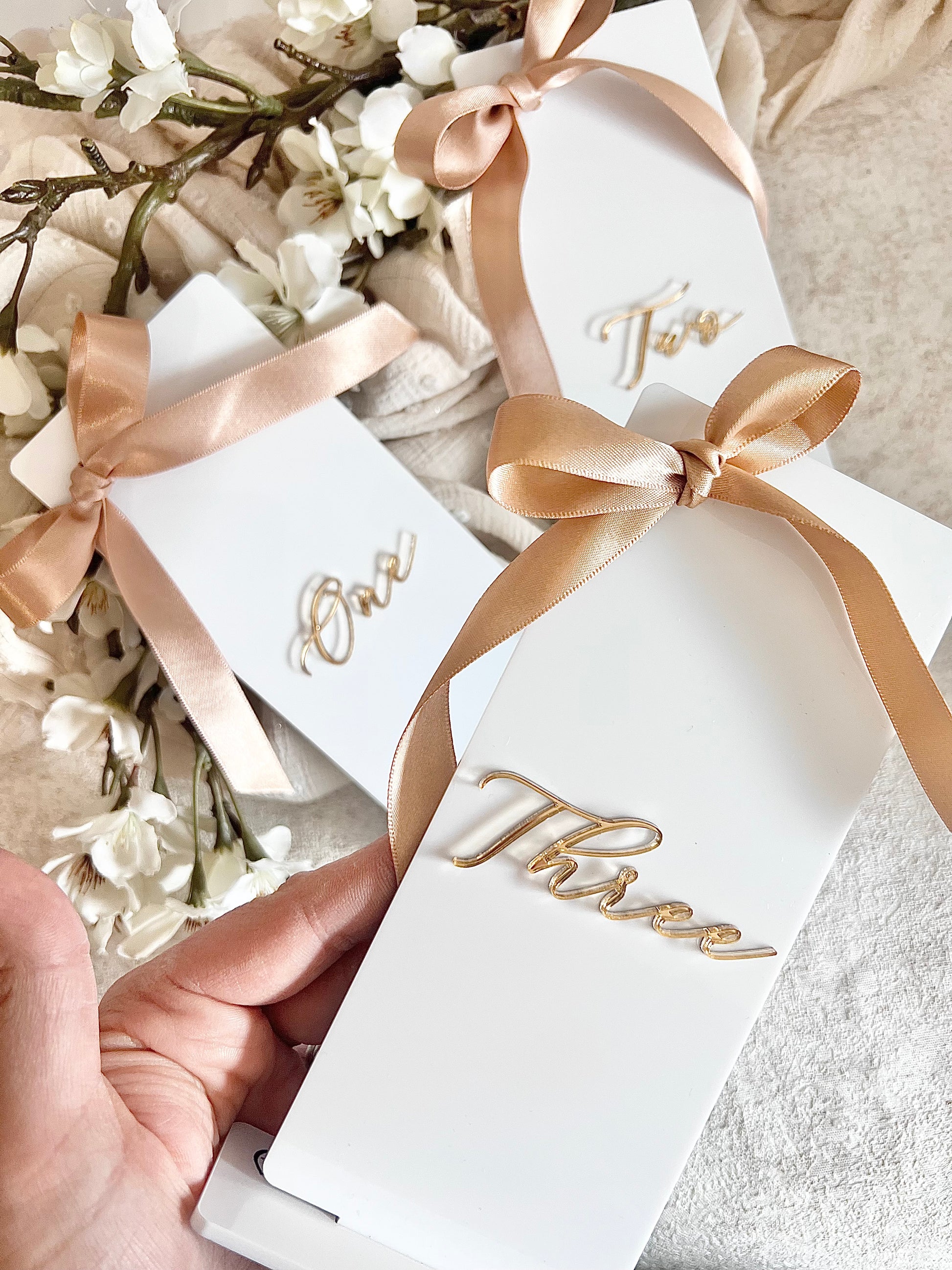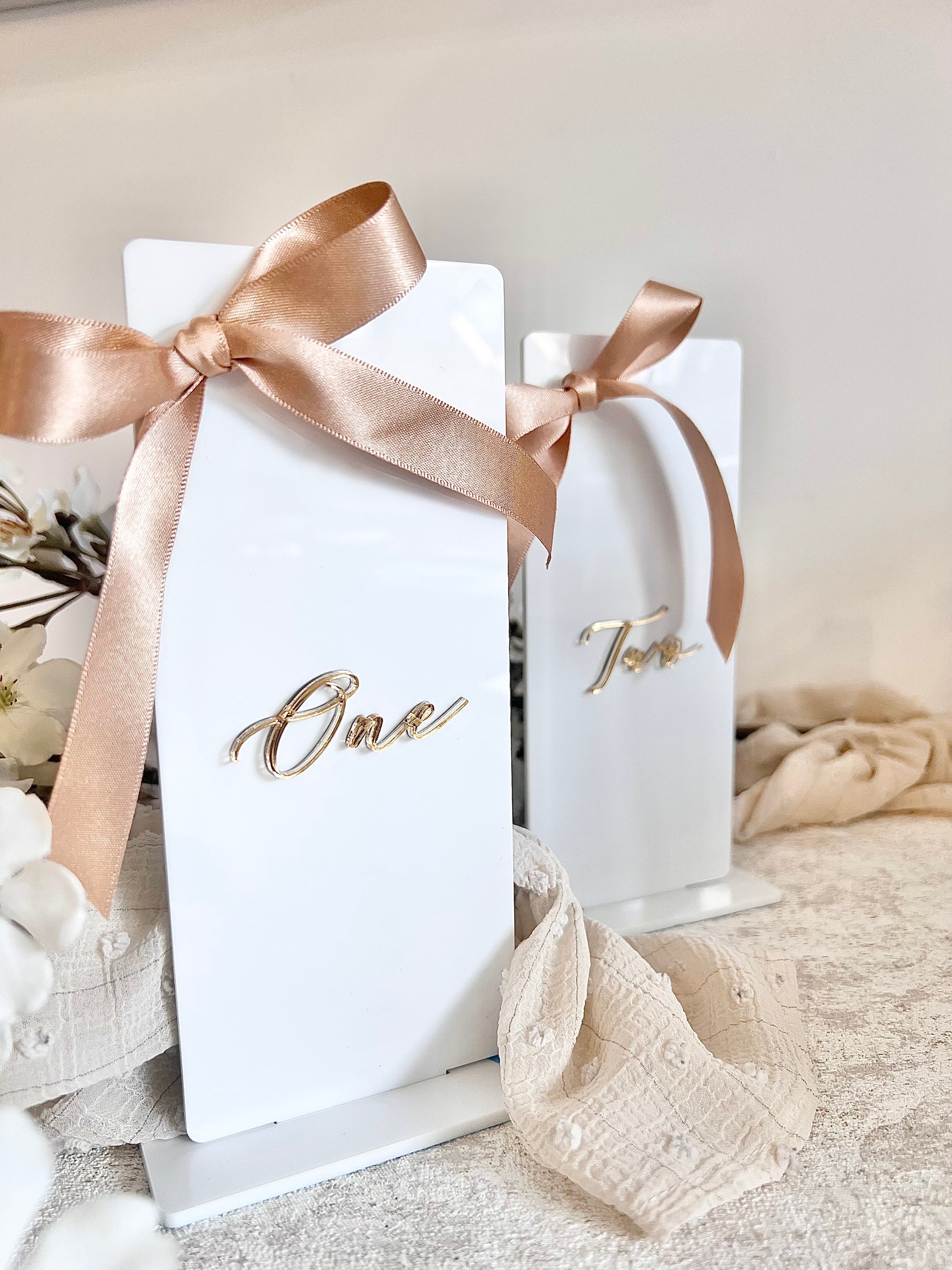 They're handmade using a beautiful white gloss acrylic, with each number added in a a choice of gold or silver mirrored acrylic, tied with a champagne colour satin bow to finish.