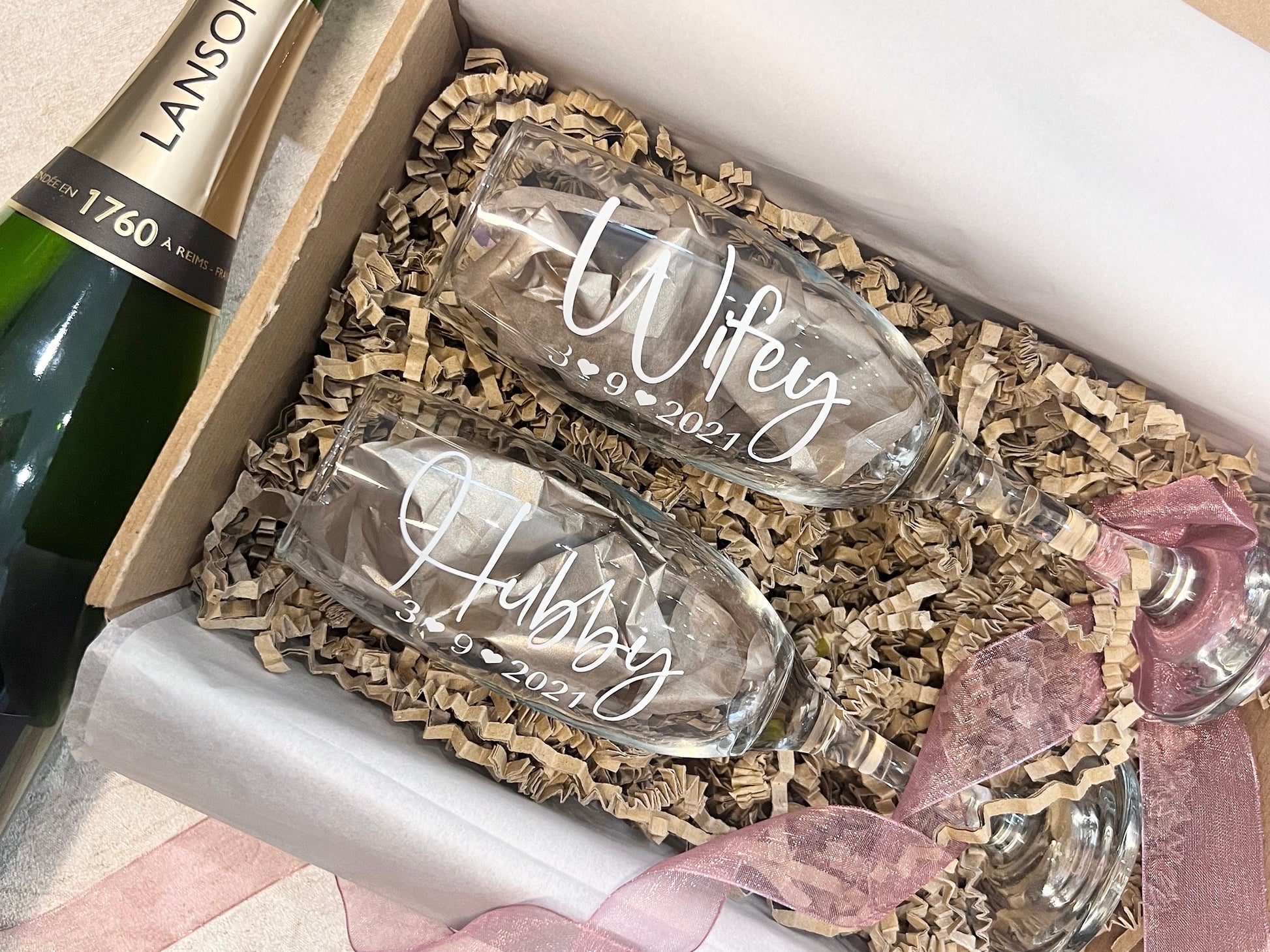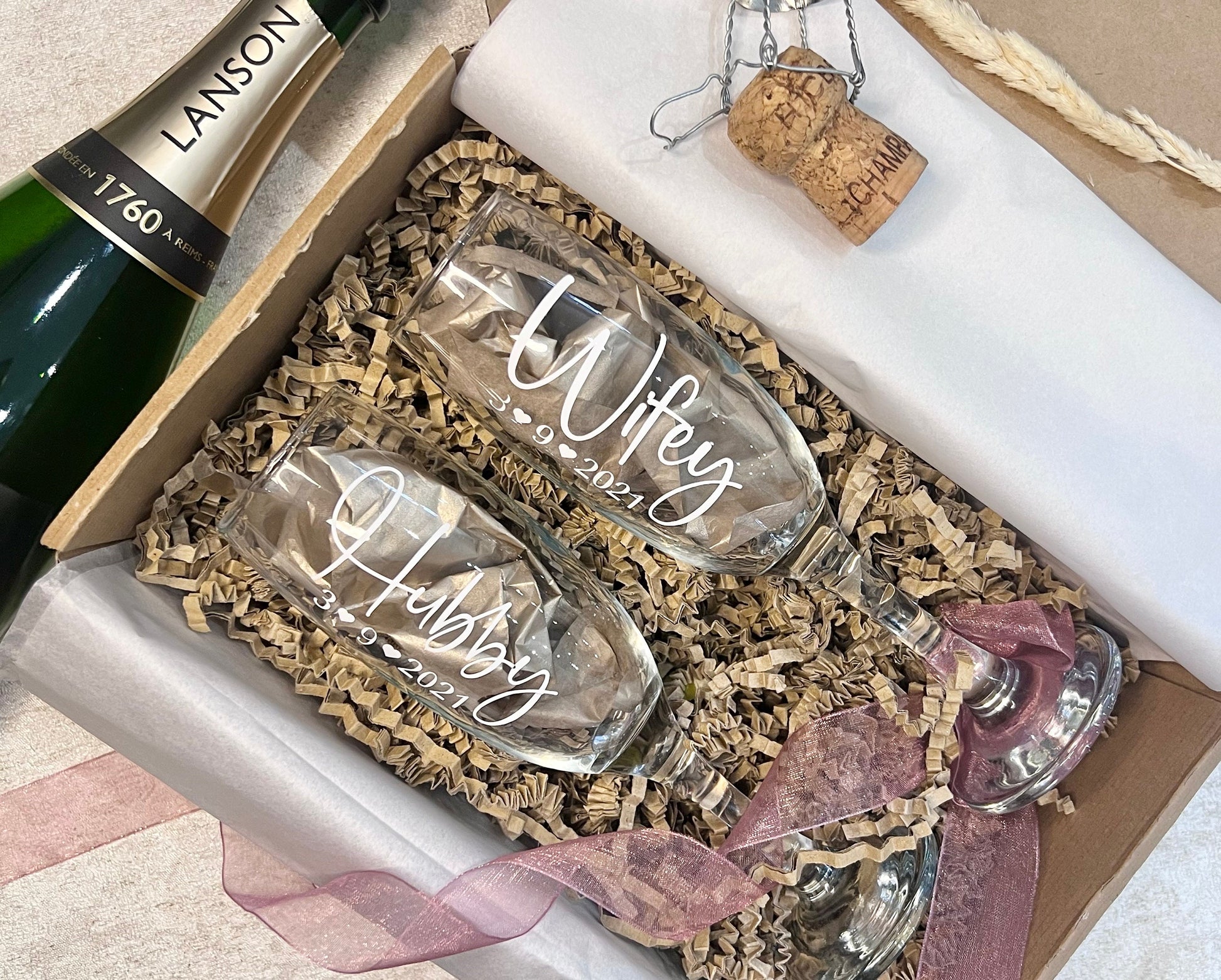 These beautiful flutes will come presented in a Kraft box, zig zag filling and tied with white organza ribbon.