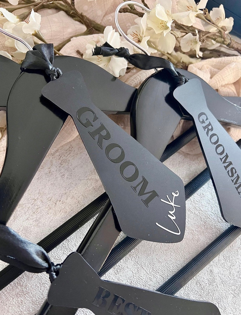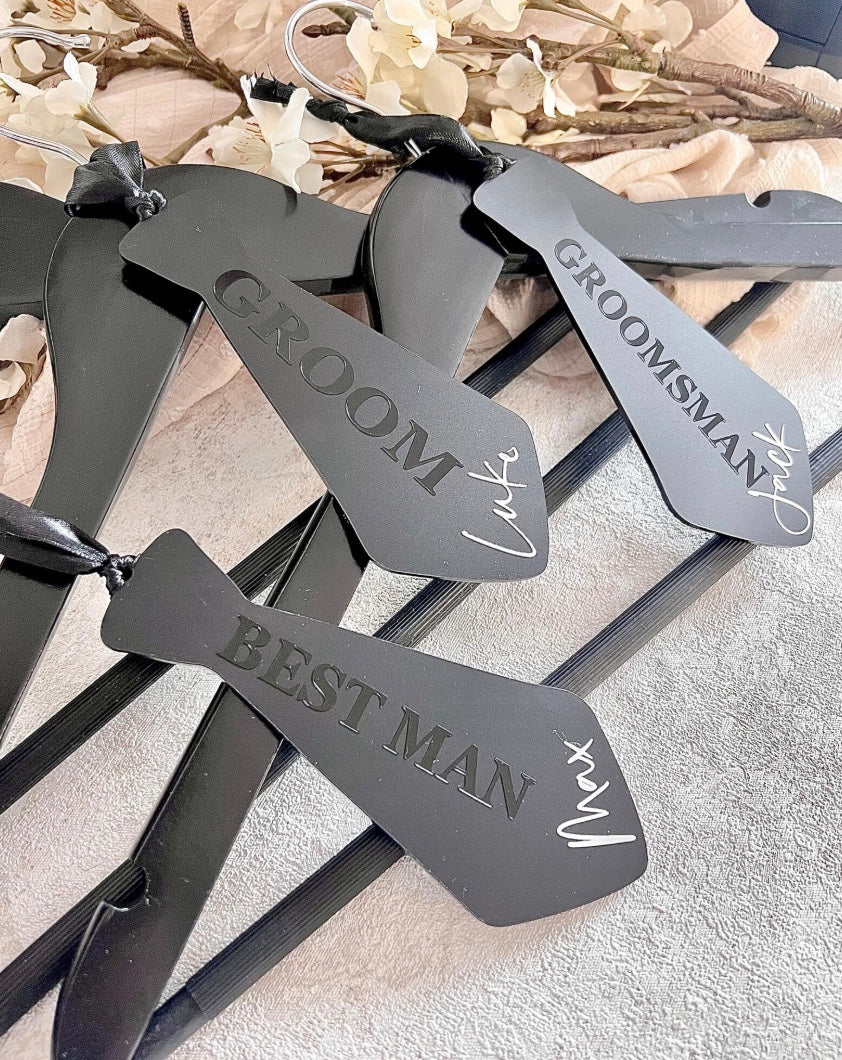 They are made using matte black acrylic, premium quality vinyl & black satin ribbon. The perfect addition to your hangers to remind you of who's suit is who's!