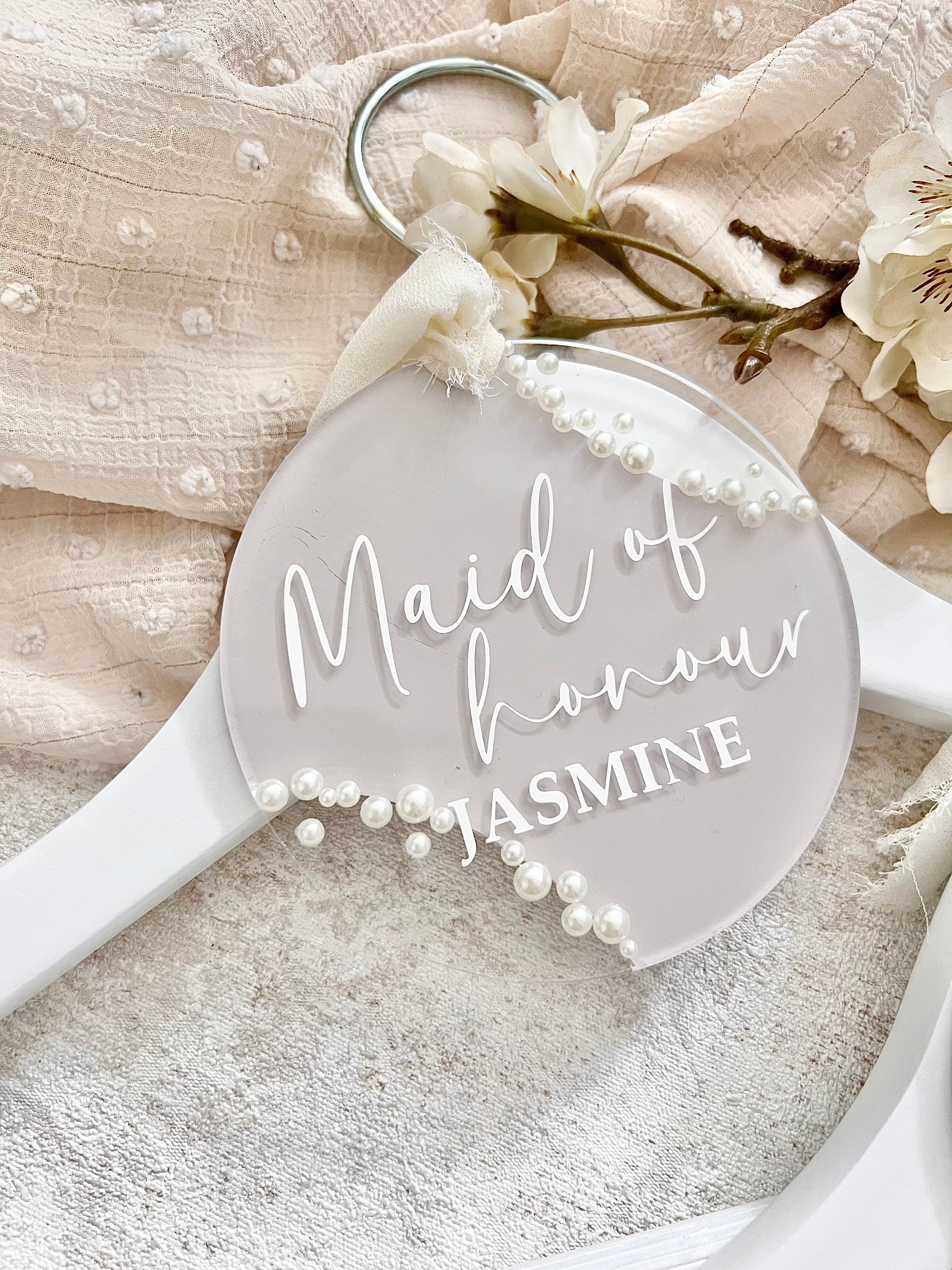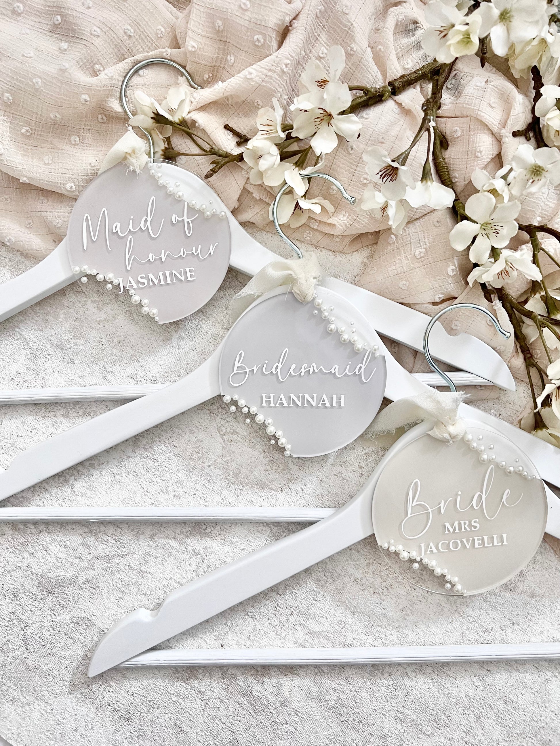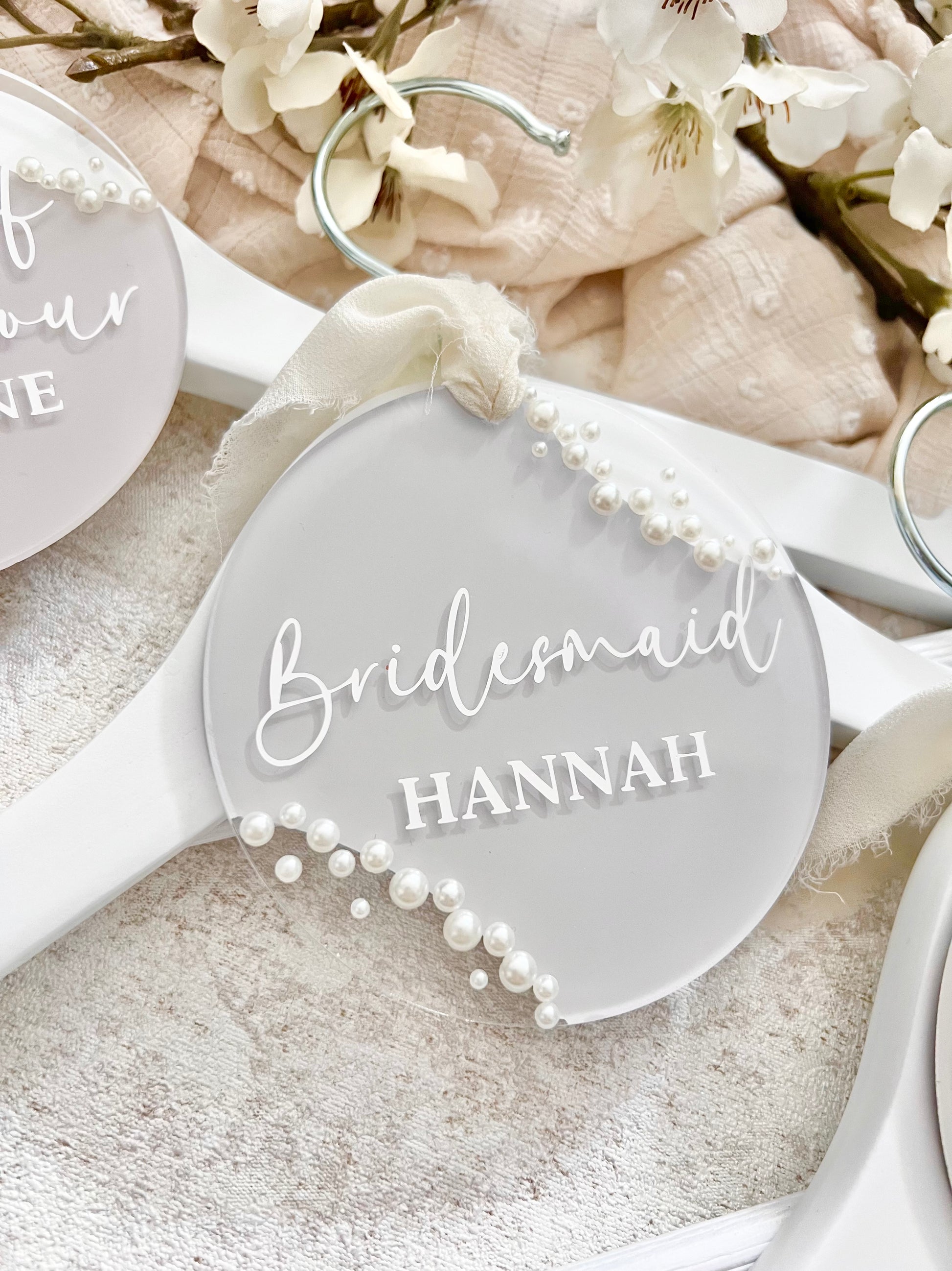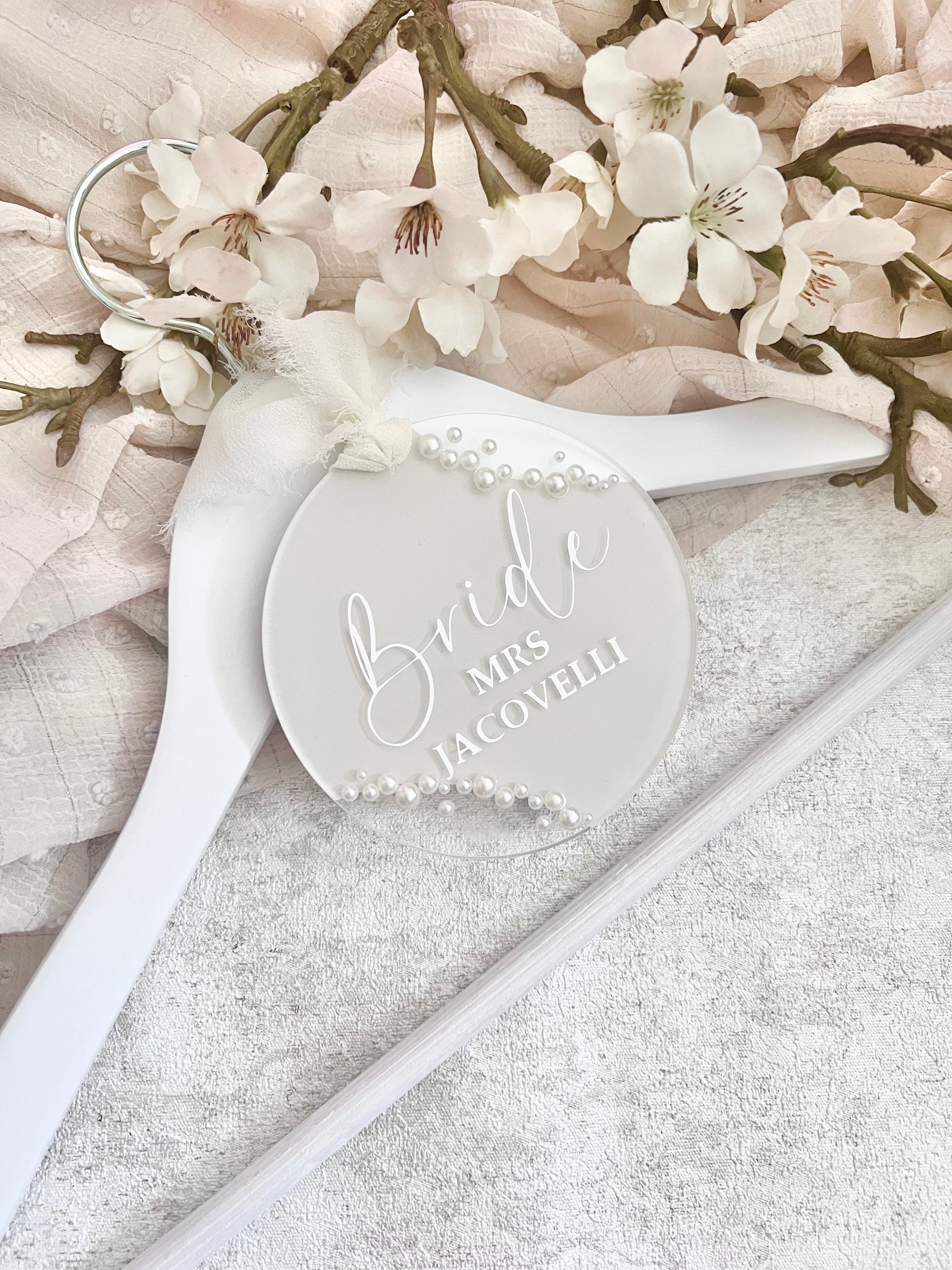My personalised Wedding Hanger Tags are handmade made to order. They handprinted on a 10cm acrylic disc, added pearls and a paint colour of your choice!