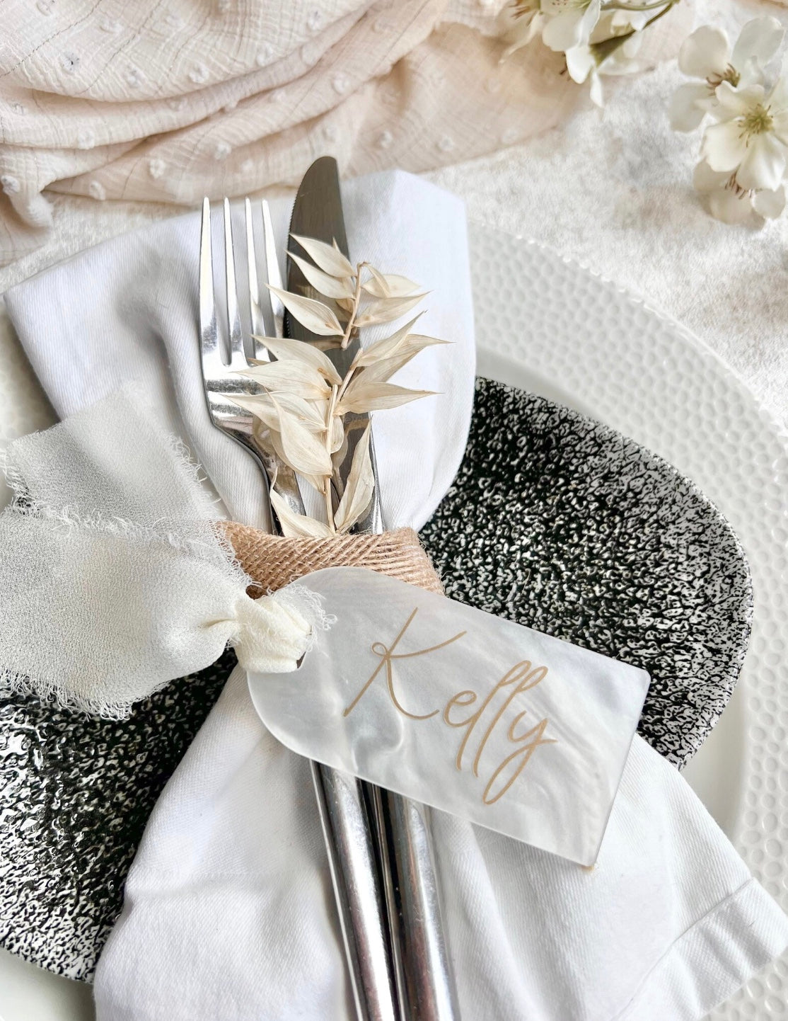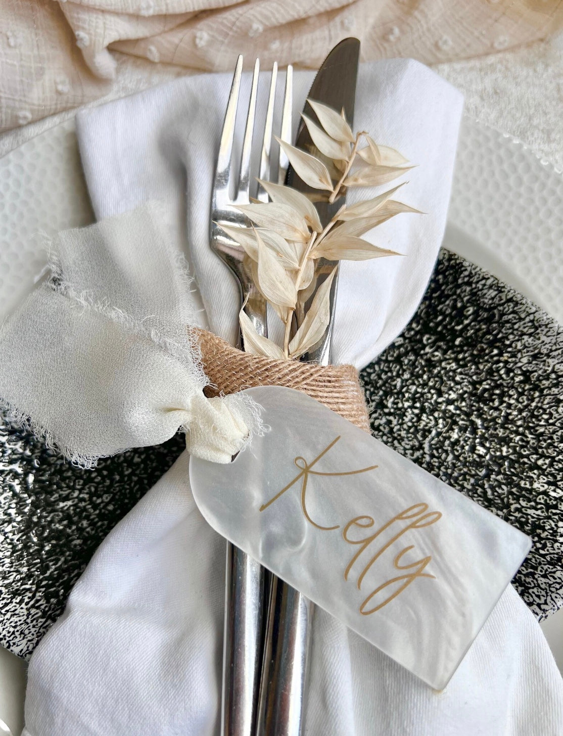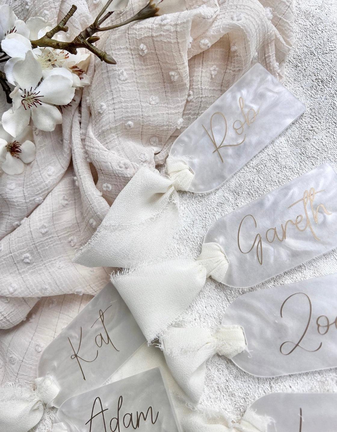 They are made using premium acrylic and 7.5cm x 4cm in size, perfect for every place setting for your wedding, party or special occasion! They will be tied with an ivory frayed ribbon to finish.