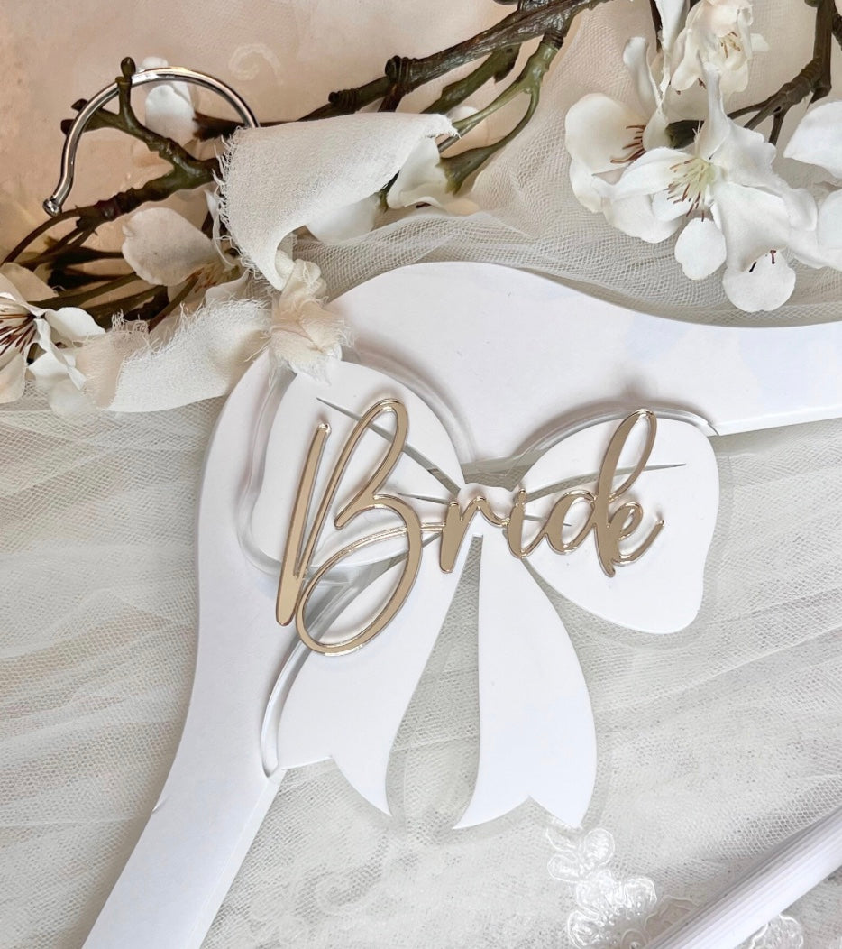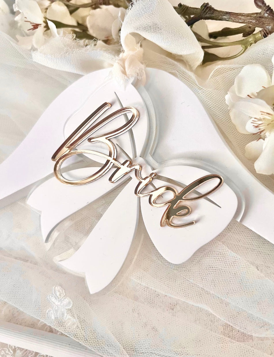 My beautiful acrylic Bride Bow 🎀 is made from premium matte white acrylic, on a clear acrylic bow, with Bride added in a choice of Gold or Silver mirrored acrylic.